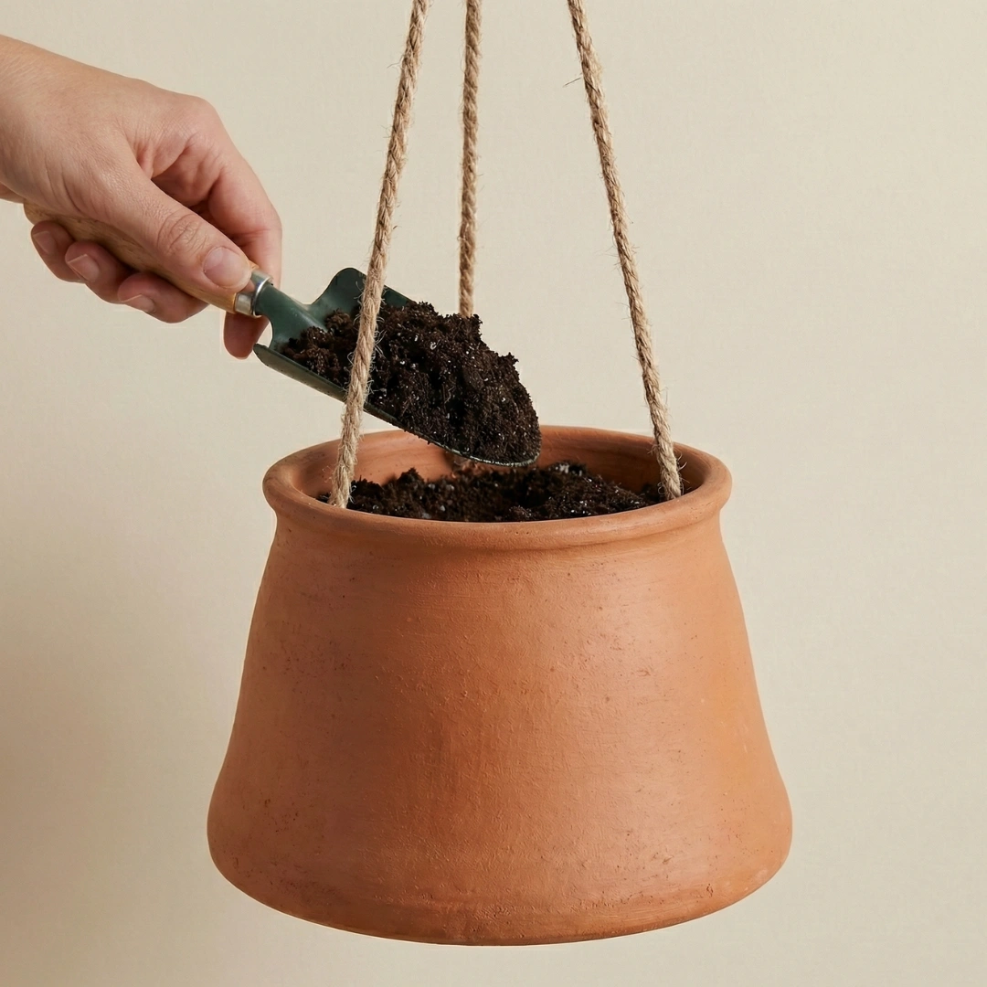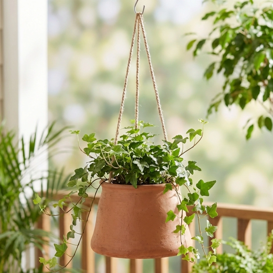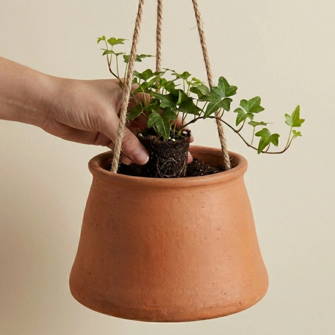 MudNest Hanging Clay Planter is perfect for balconies, windows, and indoor décor. Made from breathable clay with strong natural rope.