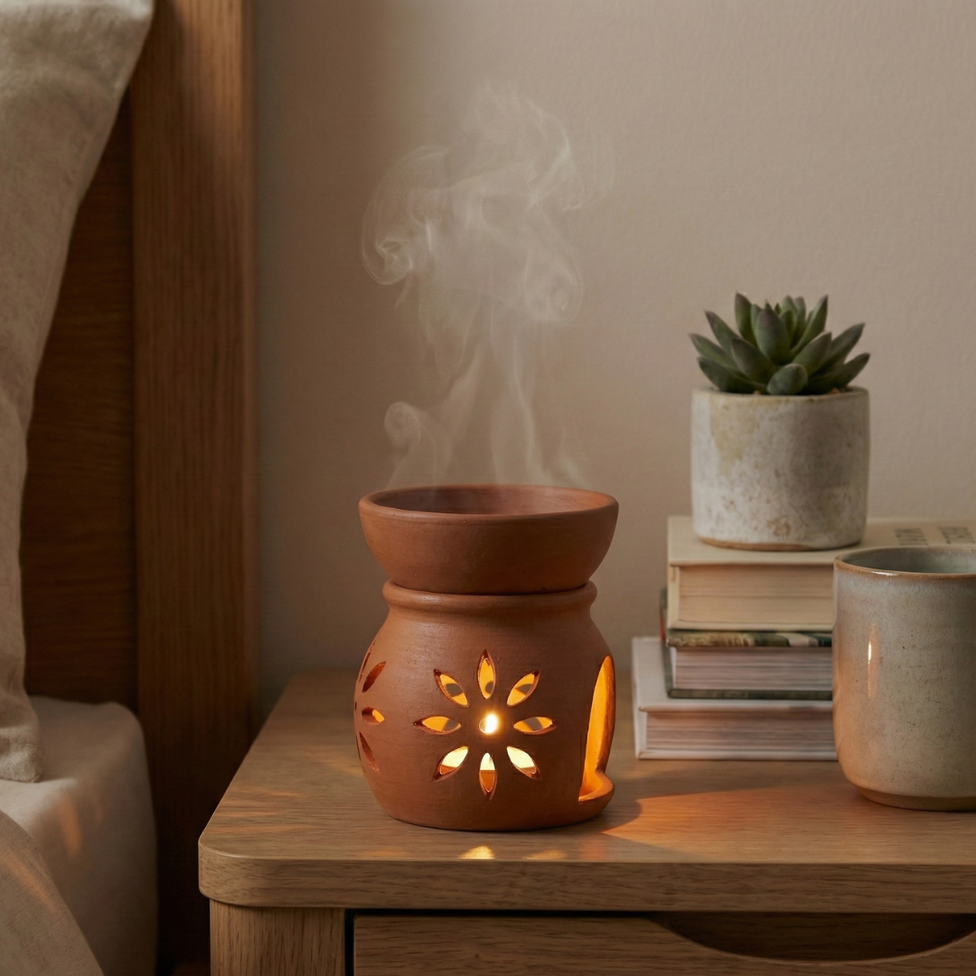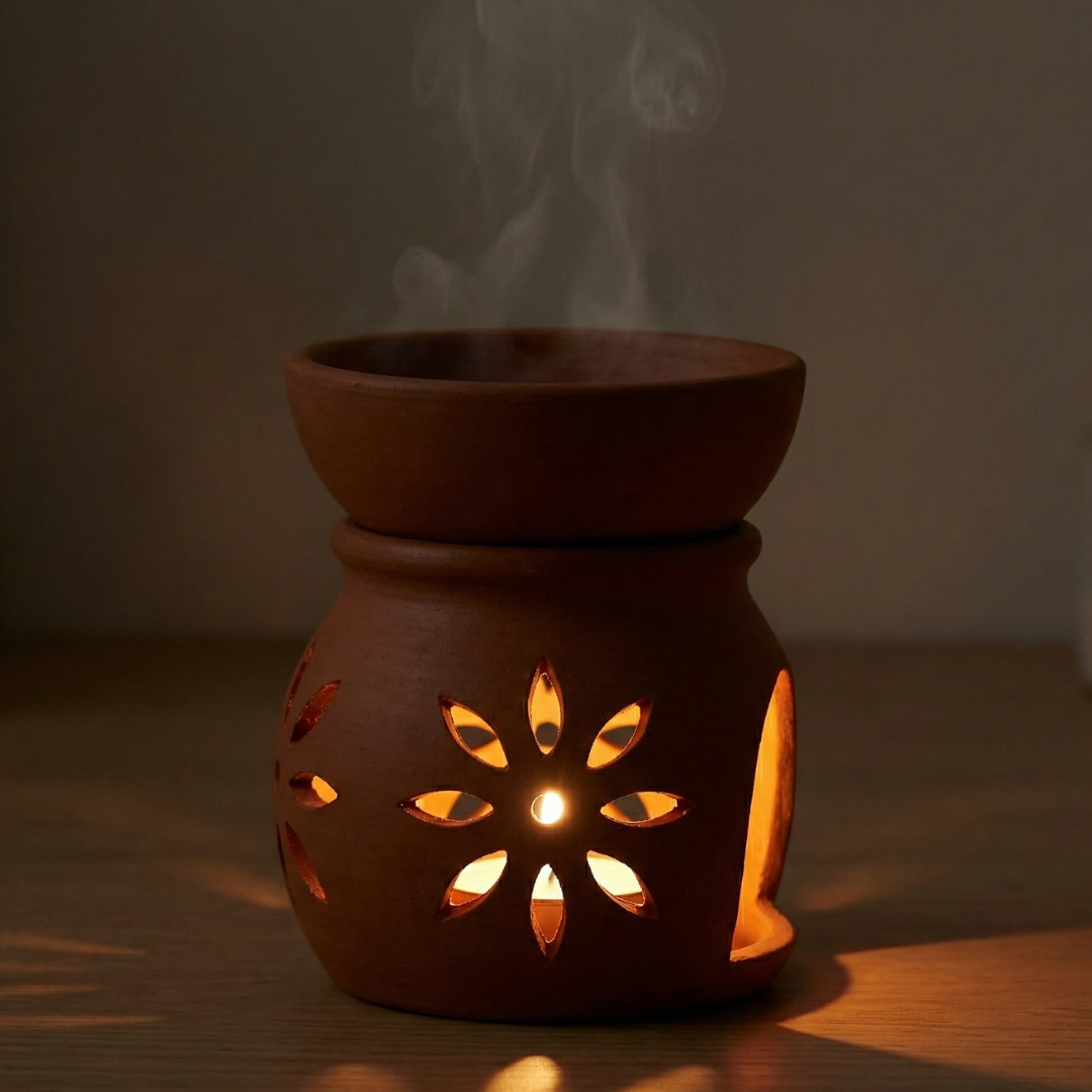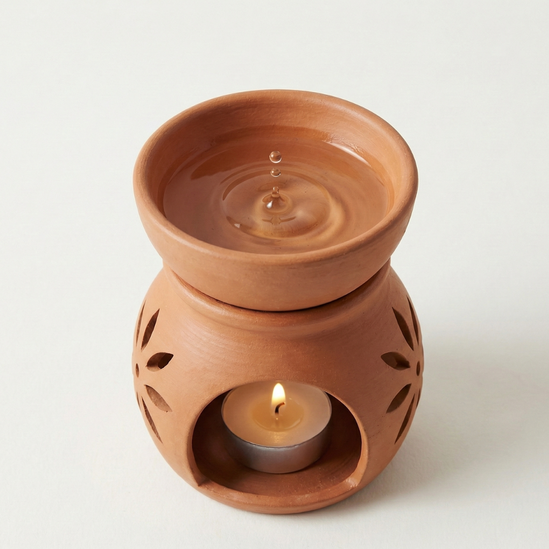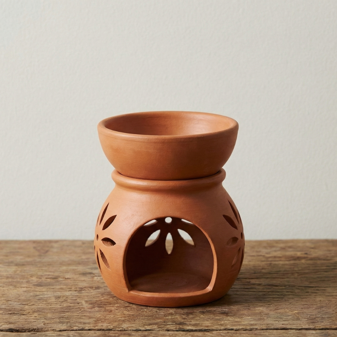This Terracotta Aroma Diffuser gently spreads fragrance using essential oils and a tealight. Clay enhances aroma naturally, creating a calm environment.